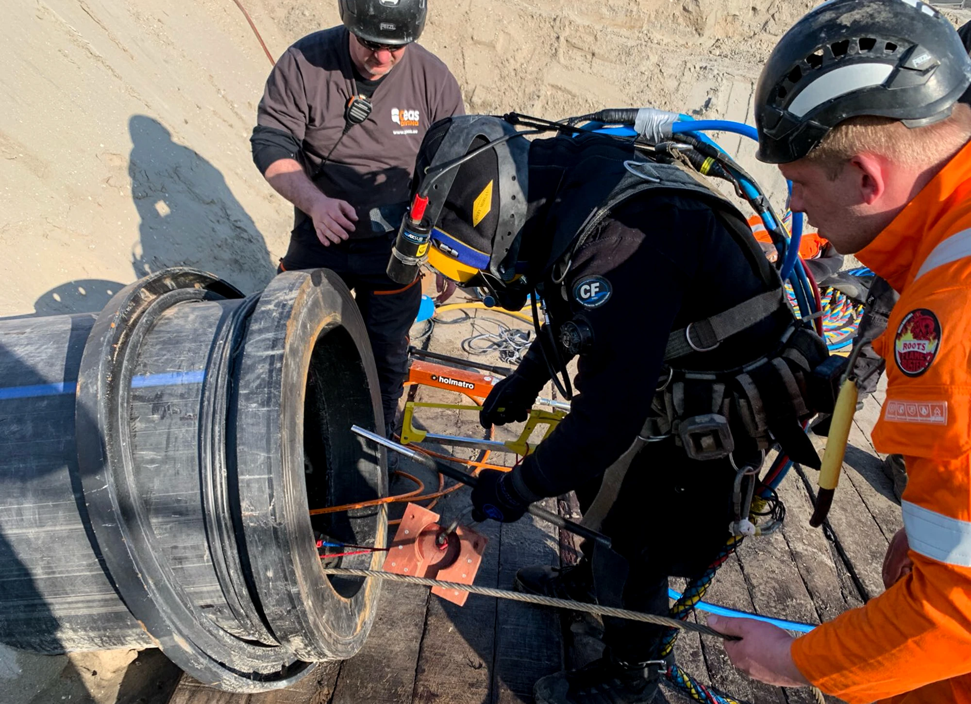 De HDPE-buis is bestemd voor het aanlanden van een grote stroomkabel afkomstig van zee. De binnendiameter van de buis is minder dan 60 cm. De buis liep onder een hoek naar beneden en was gevuld met water.